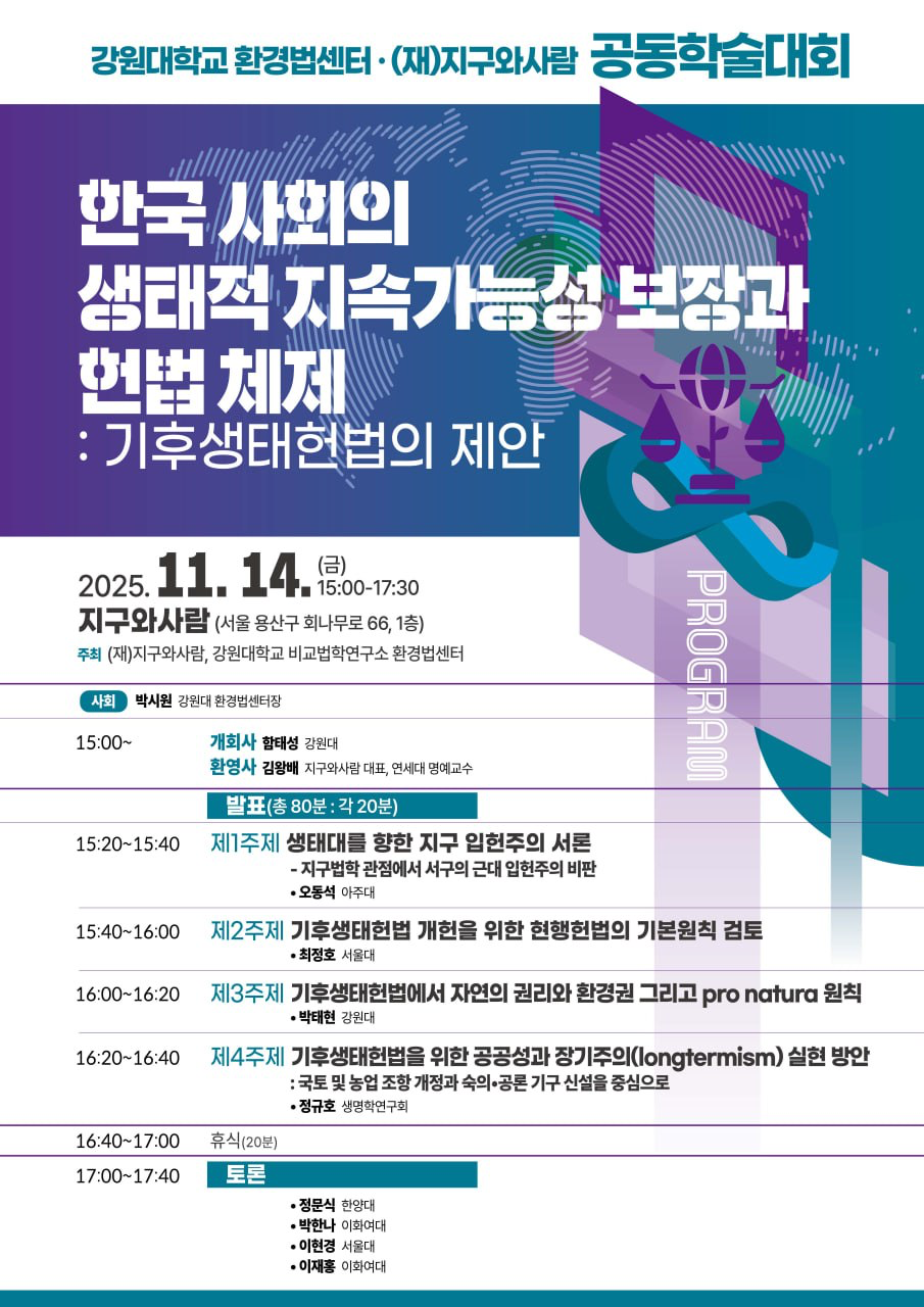 강원대 환경법센터 공동학술대회 '한국사회의 생태적 지속가능성 보장과 헌법 체제: 기후생태헌법의 제안' (2025.11.14.)