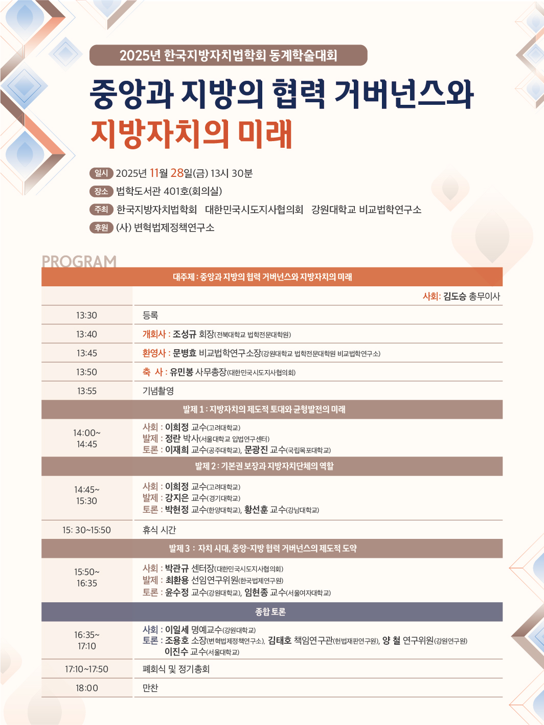 - 주최 : 한국지방자치법학회, 대한민국시도지사협의회, 강원대학교 비교법학연구소